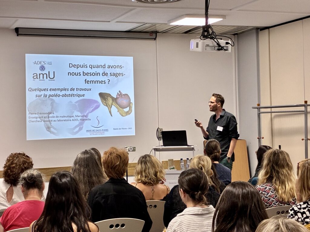 Pour finir les présentations, le Dr Pierre FREMONDIERE, sage-femme, nous a exposé son travail de recherche au sein d’Aix-Marseille Université. Il s’est intéressé à la question de l’apparition des sages-femmes dans l’histoire de l’hominisation et les processus qui ont conduit à l’apparition de la profession.